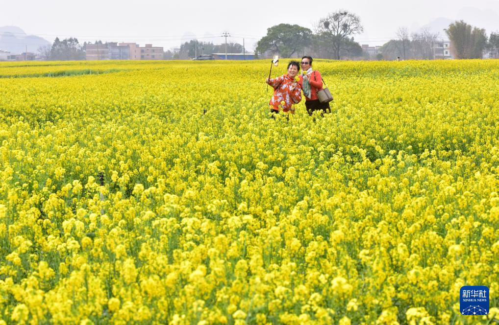 2月24日,游客在广西钟山县公安镇油菜花田赏花拍照。