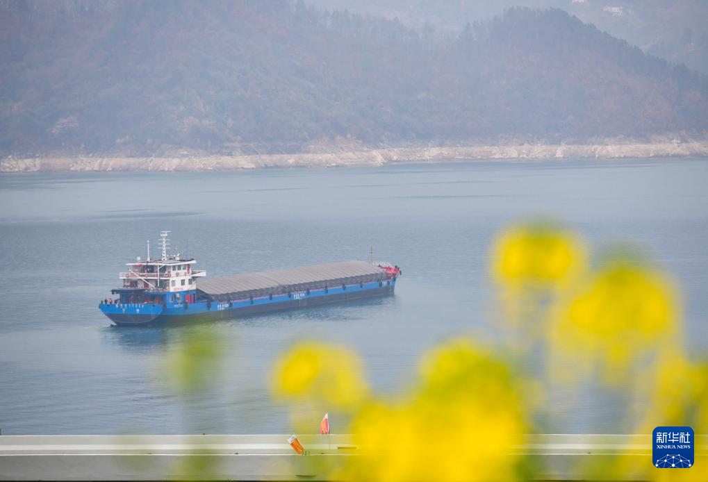 2月23日,船舶行驶在三峡大坝上游的湖北省宜昌市秭归县水域,两岸油菜花竞相绽放。