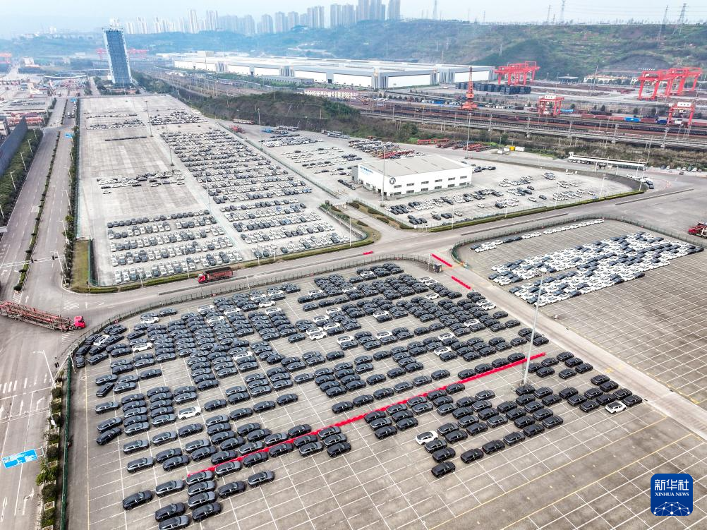 这是2月25日拍摄的重庆两江新区果园港停放的商品车(无人机照片)。