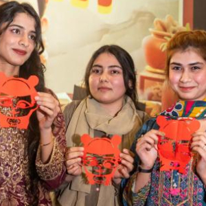 2月25日,在长沙摩天轮国际影城,留学生们和志愿者(左一)在展示“哪吒”剪纸作品。