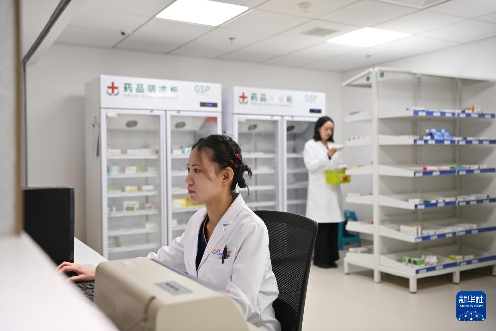 2月26日,医护人员在天津鹏瑞利医院门诊药房工作。