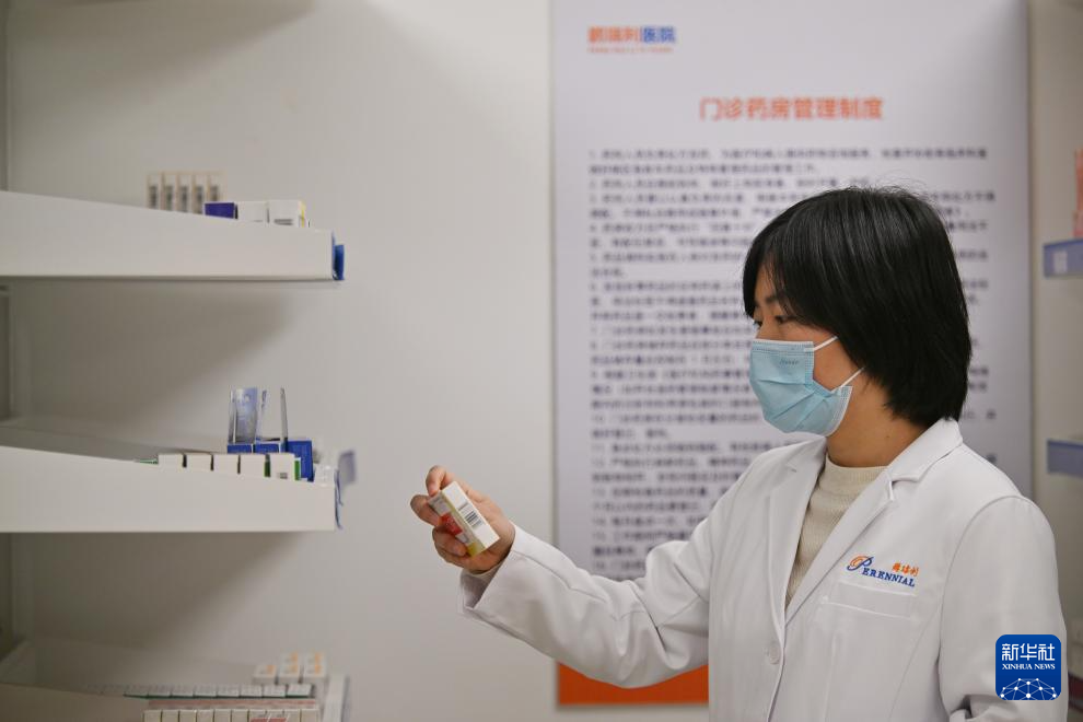 2月26日,医护人员在天津鹏瑞利医院门诊药房查看药品。