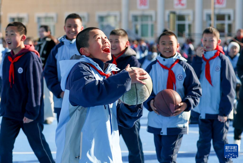 图为在新疆乌鲁木齐县第一中学小学部,学生在大课间打篮球(2月21日摄)。