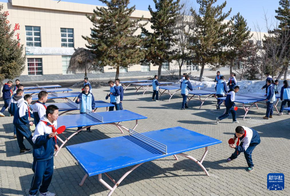 图为在新疆乌鲁木齐县第一中学,学生们在体育课上打乒乓球(2月21日摄)。