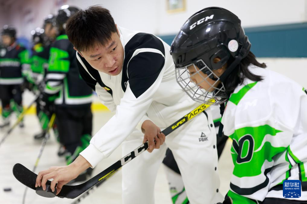 图为在新疆教育学院实验小学,体育老师在体育课上指导学生练习冰球(2月20日摄)。