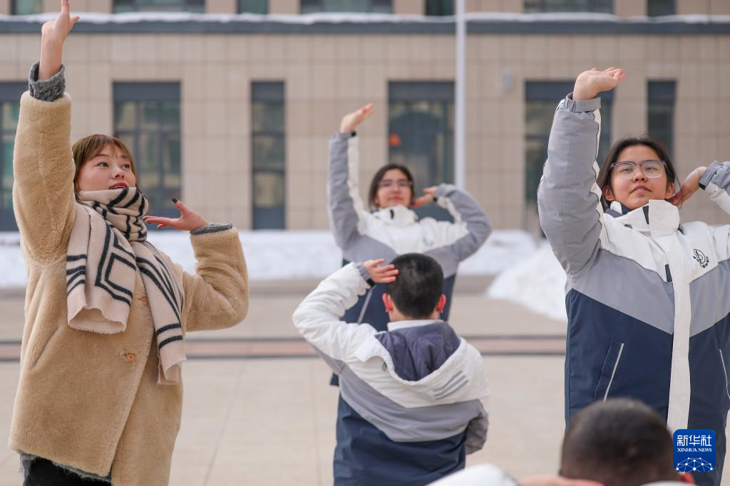 图为在新疆乌鲁木齐市第一中学,老师指导学生在大课间做民族舞健身操(2月20日摄)。