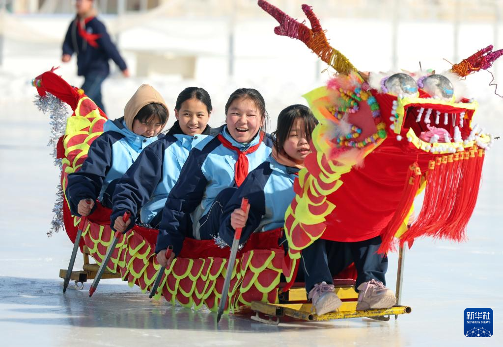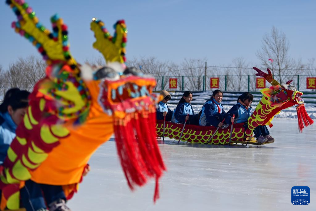 图为在新疆乌鲁木齐县第一中学,学生们在体育课上进行冰上龙舟赛(2月21日摄)。