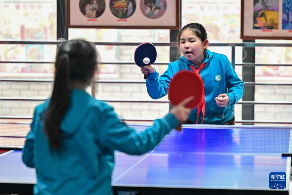 图为在新疆乌鲁木齐市第一小学,学生在体育课上练习乒乓球(2月24日摄)。