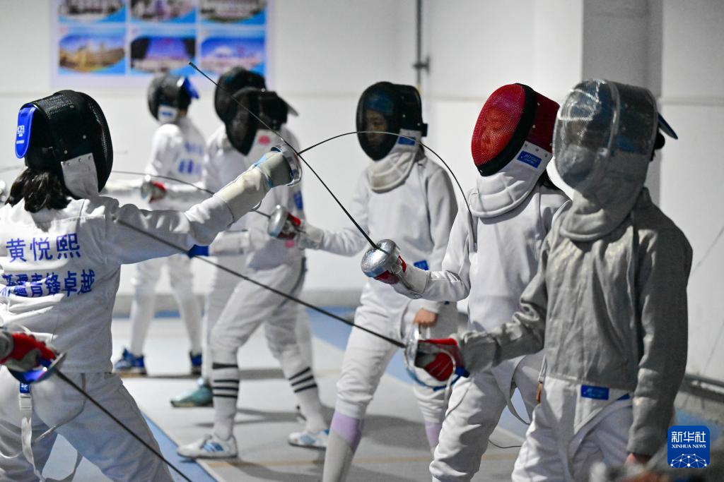 图为在新疆乌鲁木齐市第一小学,学生在体育课上练习击剑(2月24日摄)。