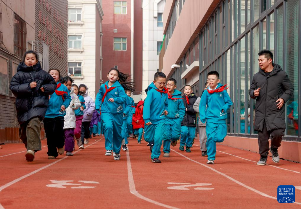 图为在新疆乌鲁木齐市第一小学,学生在体育课上跑步(2月20日摄)。