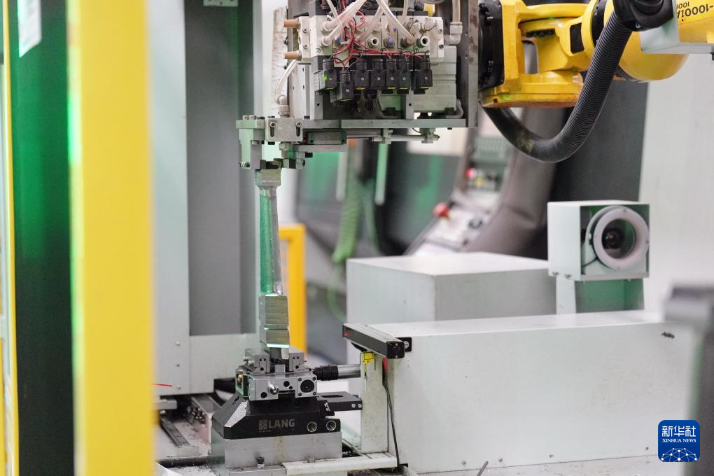 在哈尔滨汽轮机厂有限责任公司叶片分厂,中小叶片智能生产线上的机械臂在安装卡紧汽轮机叶片(2月26日摄)。