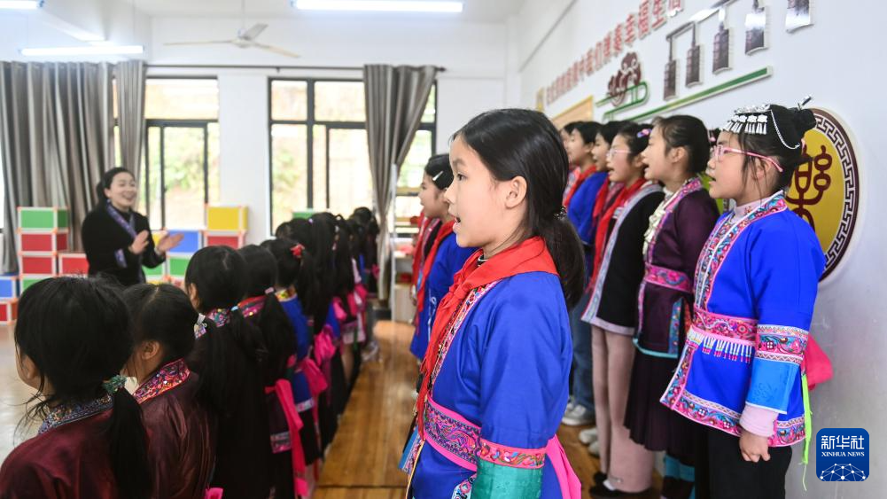 2月27日,广西三江侗族自治县江川小学的学生在学唱侗族大歌。