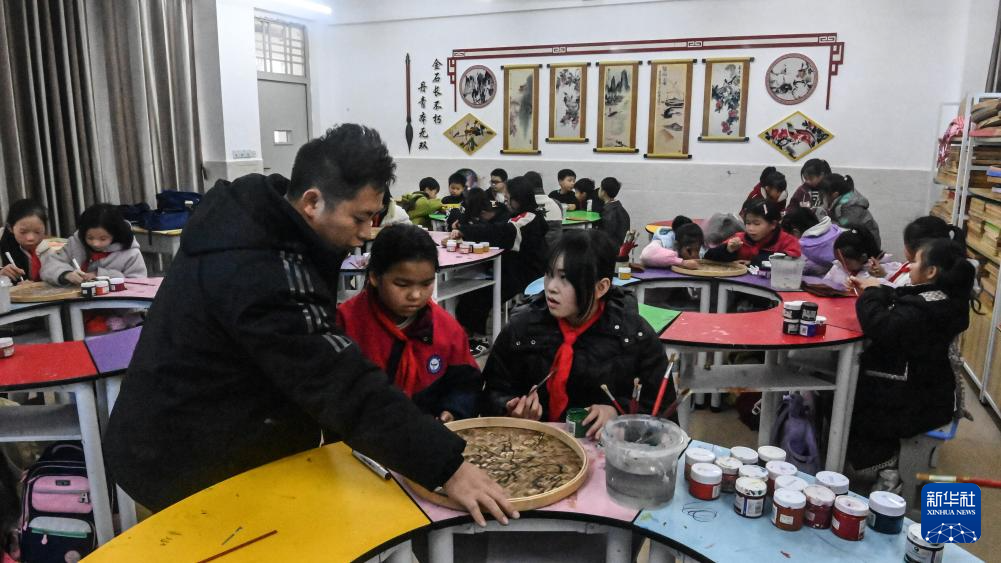 2月27日,在广西三江侗族自治县江川小学,一名老师在教授学生学习侗族农民画。