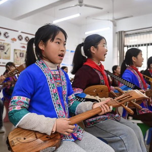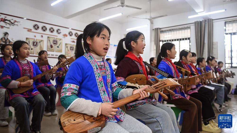 2月27日,广西三江侗族自治县江川小学的学生在学习弹唱侗族琵琶歌。