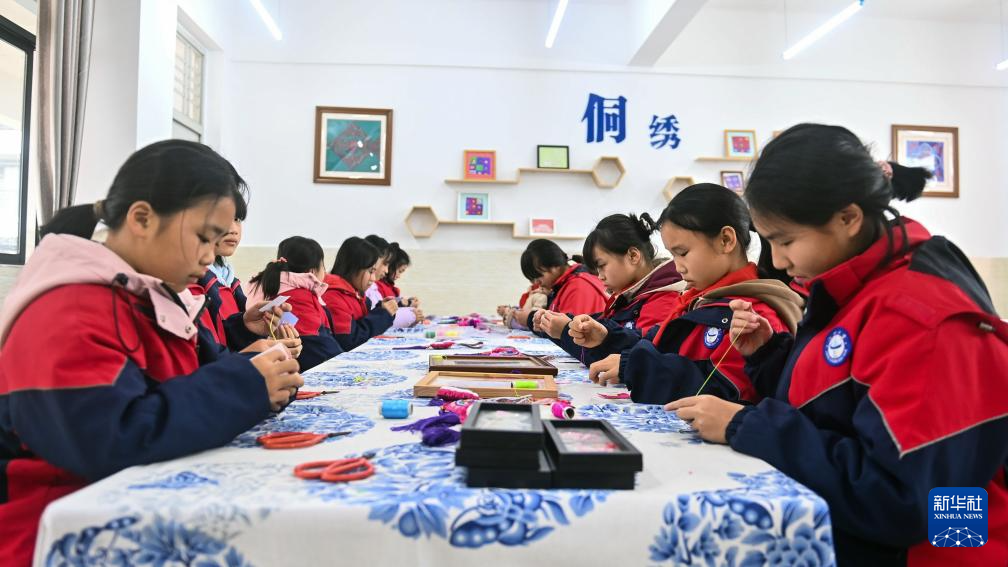 2月27日,广西三江侗族自治县江川小学的学生在学习侗族刺绣。