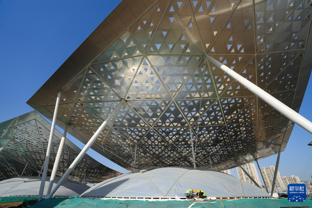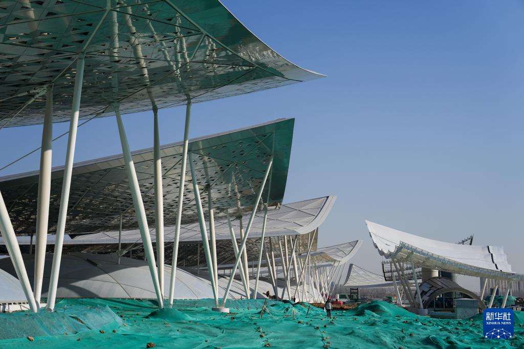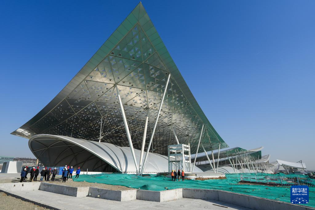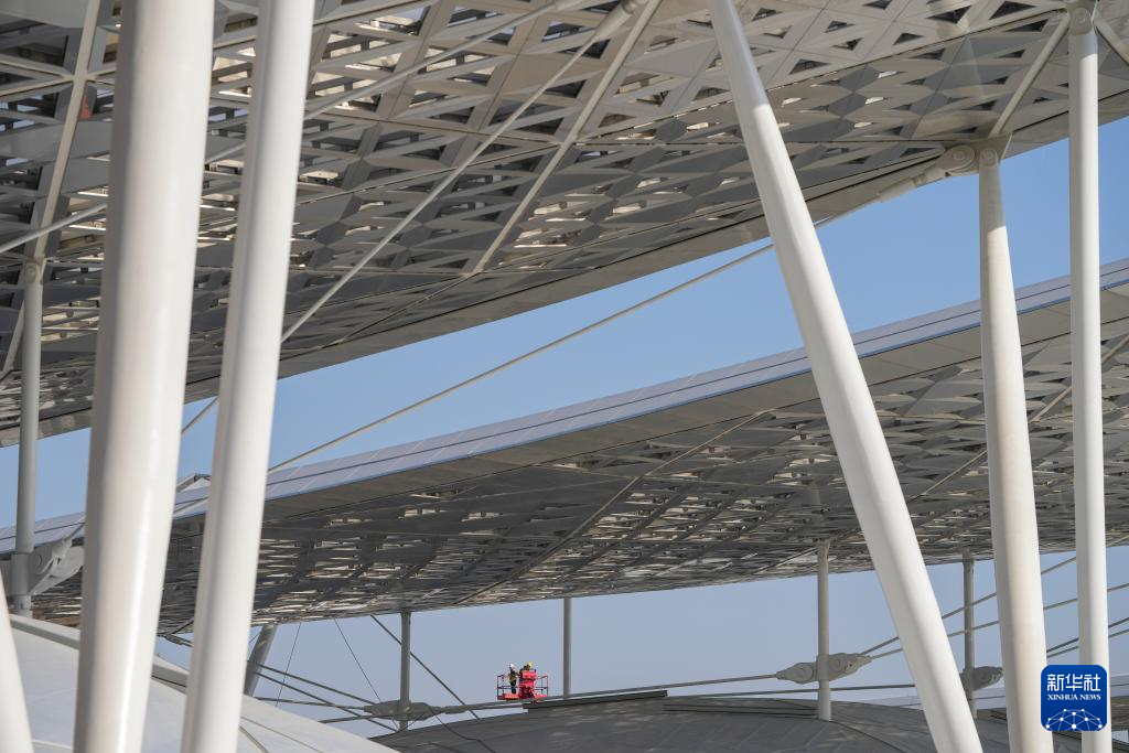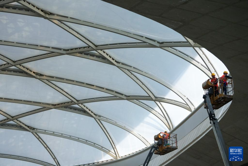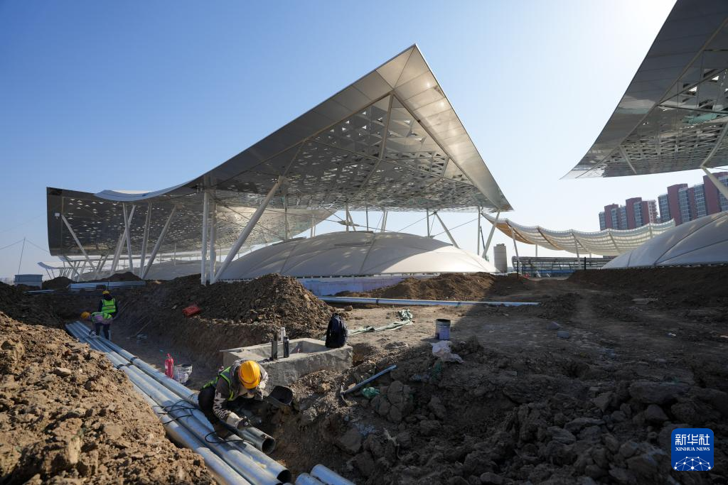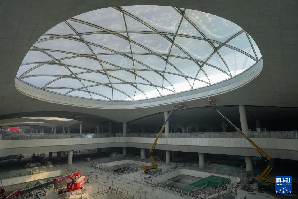 在北京城市副中心站综合交通枢纽工程现场,“京帆”屋盖片片扬起,屋盖下的站内,施工正在紧张进行。
