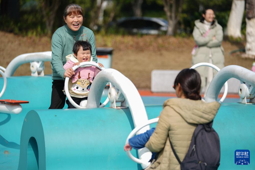 2月27日,市民带着小朋友在长沙市银杏公园玩耍。