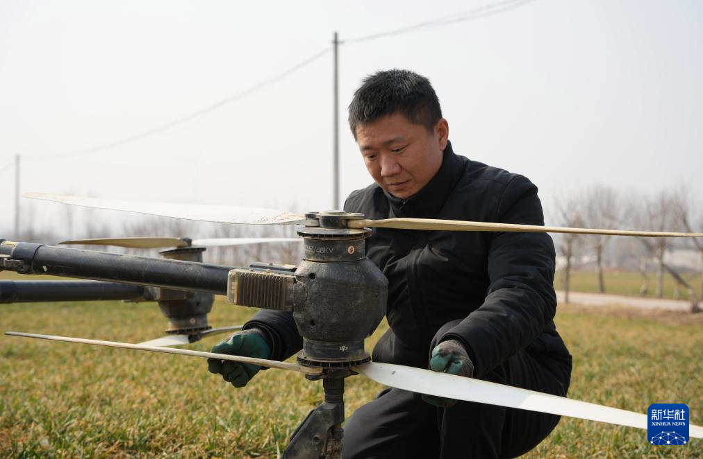 2月27日,植保无人机飞手陈波在山东省新泰市禹村镇检查无人机桨叶。