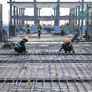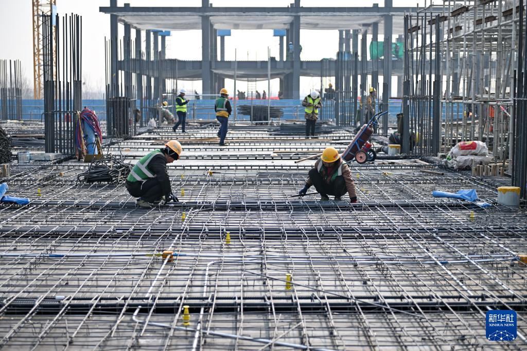 2月27日,中国五冶集团工人在雄安新区起步区第五组团大学城配套一期项目三标段建设现场捆绑钢筋。
