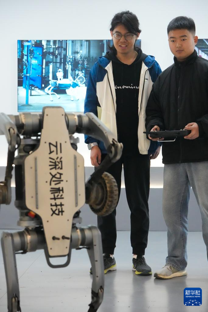 2月28日,杨俊(左)向同事学习一款全地形越野机器人的操控。