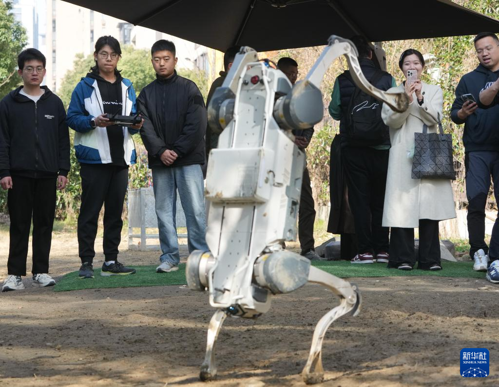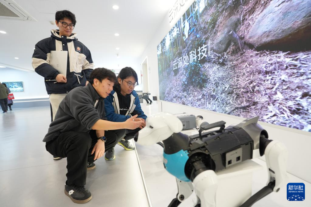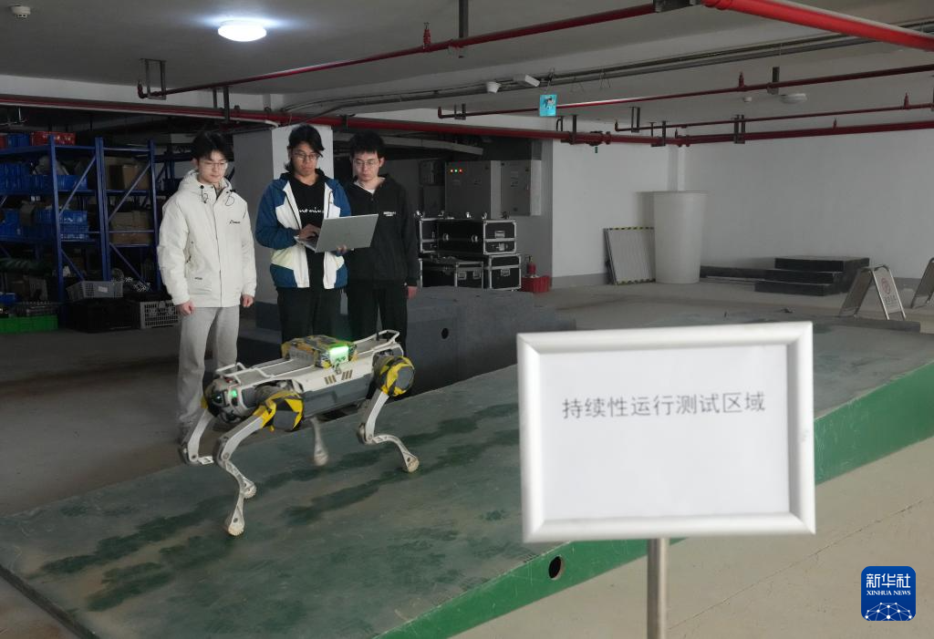 2月28日,杨俊(中)和同事在公司内部测试区域调试机器狗。