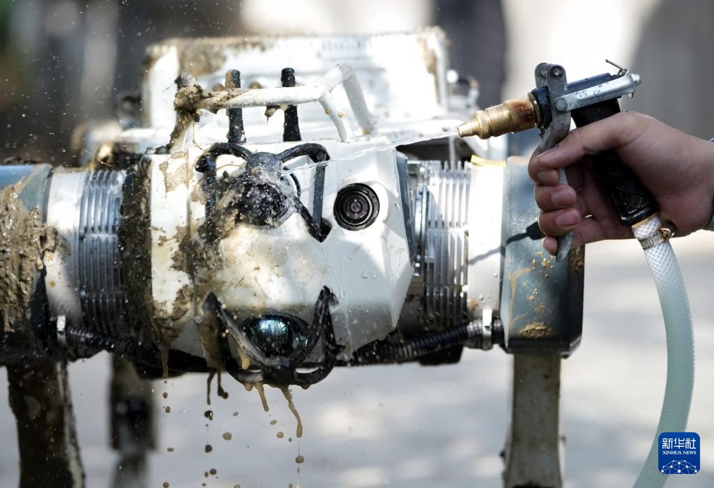 2月28日,杨俊在一场演示完毕后冲洗四足机器人。