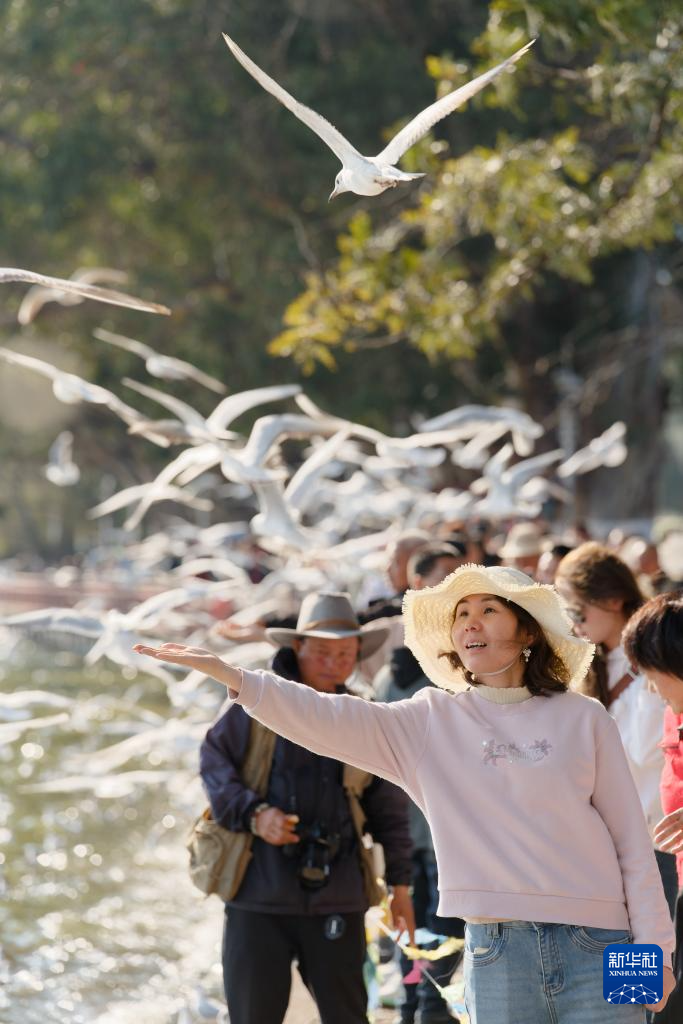 2月28日,游人在昆明市海埂公园与红嘴鸥互动。