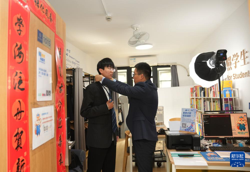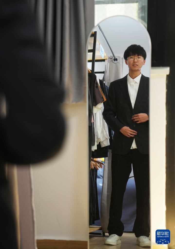 2月28日,在上外学生宿舍区的服务点,一名学生在试穿借用正装。