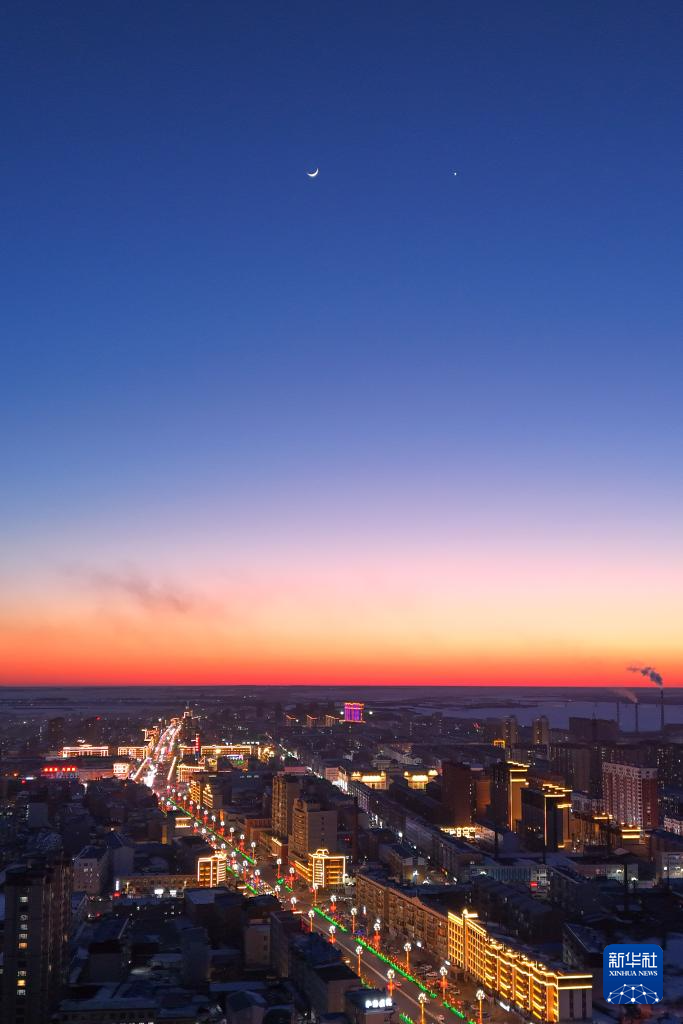 3月2日在黑龙江省富锦市拍摄的金星伴月(无人机照片)。