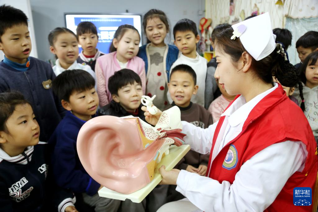 2月28日,江苏省连云港市东方医院的医务人员给连云港市核电钟声幼儿园小朋友讲解耳朵的构造及护耳知识。