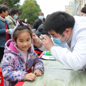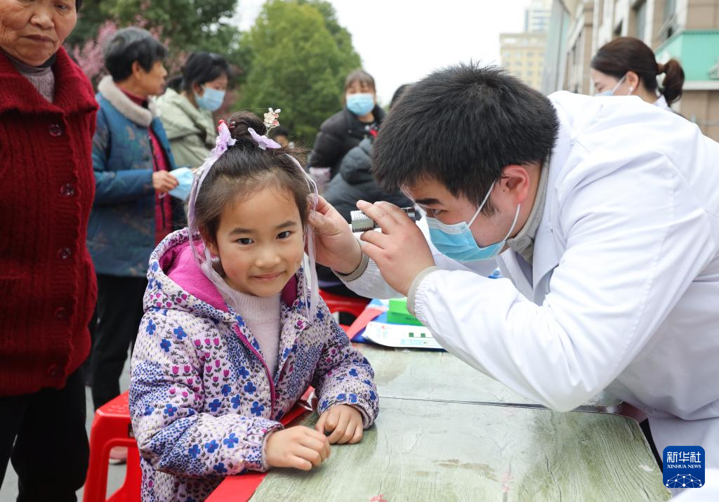 3月1日,在安徽省合肥市肥西县上派镇四十埠社区开展的爱耳日义诊进小区活动现场,医生为一名小朋友进行耳朵健康检查。