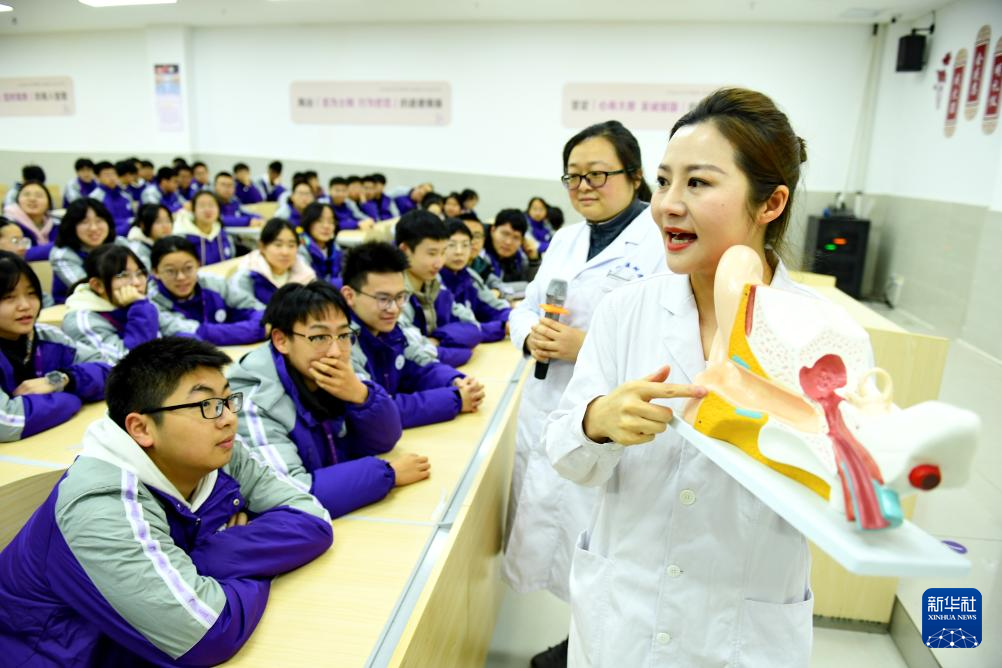 3月1日,在四川省南充高级中学临江校区,川北医学院附属医院的医师为同学们讲解耳朵构造及科学护耳知识。