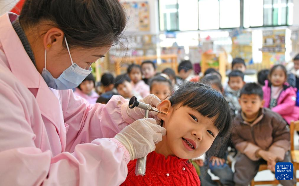 2月28日,在浙江省台州市仙居县中心幼儿园,医护人员为一名小朋友检查耳朵。