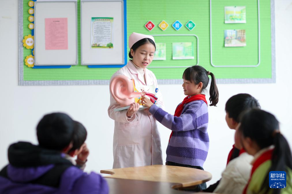 3月2日,医务人员在江苏省兴化市昌荣镇陈唐村新时代文明实践站给学生讲解耳朵的构造及护耳知识。