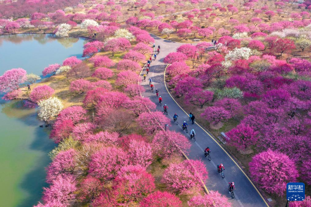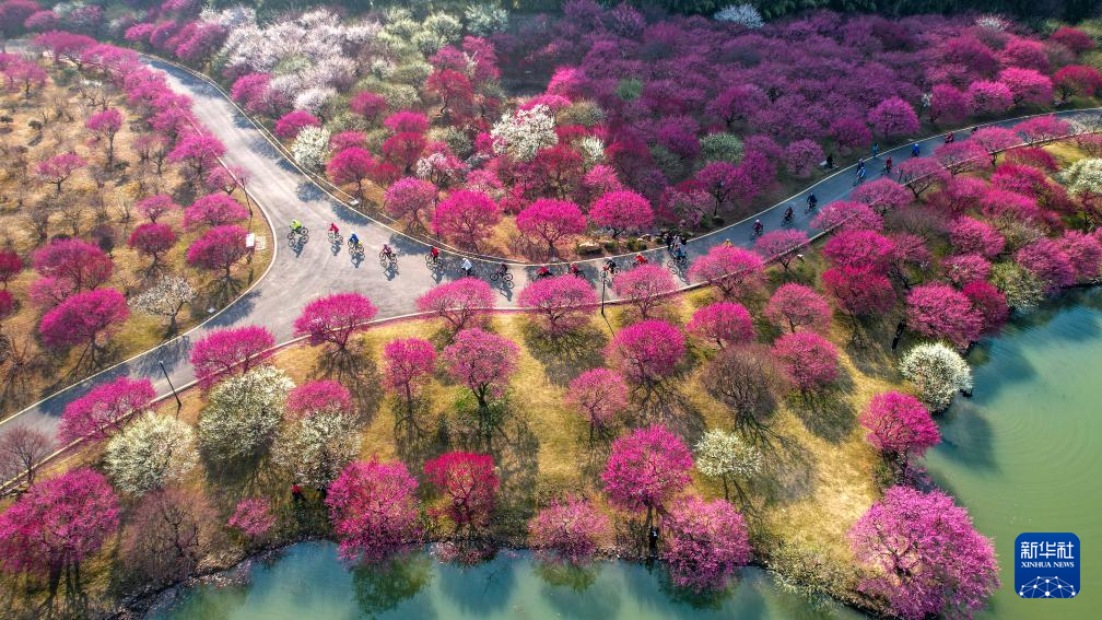 3月2日,在浙江省湖州市长兴县太湖龙之梦东方盆景园,骑行爱好者们骑行赏梅(无人机照片)。