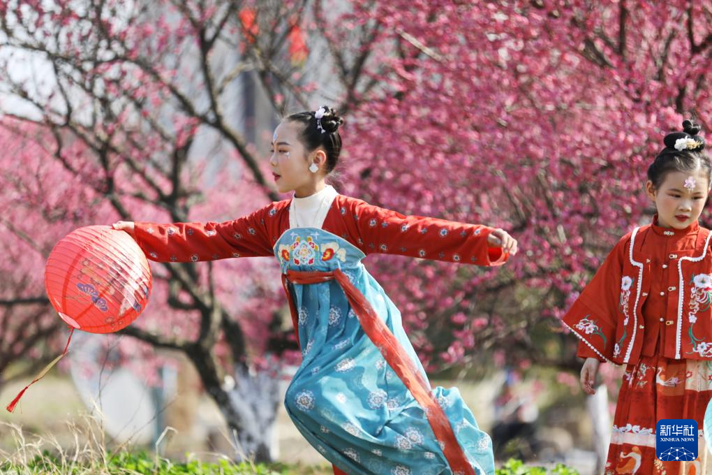 3月1日,在浙江省嘉兴市秀洲区王店镇南梅村梅园,身穿汉服的小朋友在游园赏梅。