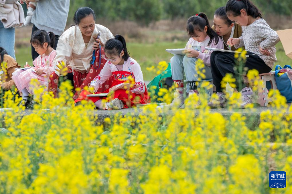 3月1日,小朋友在广西梧州市龙圩区龙圩镇念村稻渔综合种养示范基地油菜花田写生。