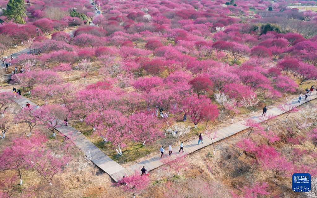 3月1日,众多游客在南京梅花山景区赏花踏青(无人机照片)。