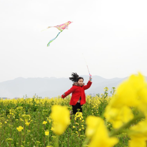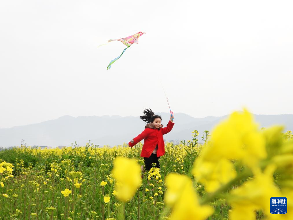 3月1日,小朋友在四川省达州市开江县普安镇油菜花田间放风筝。