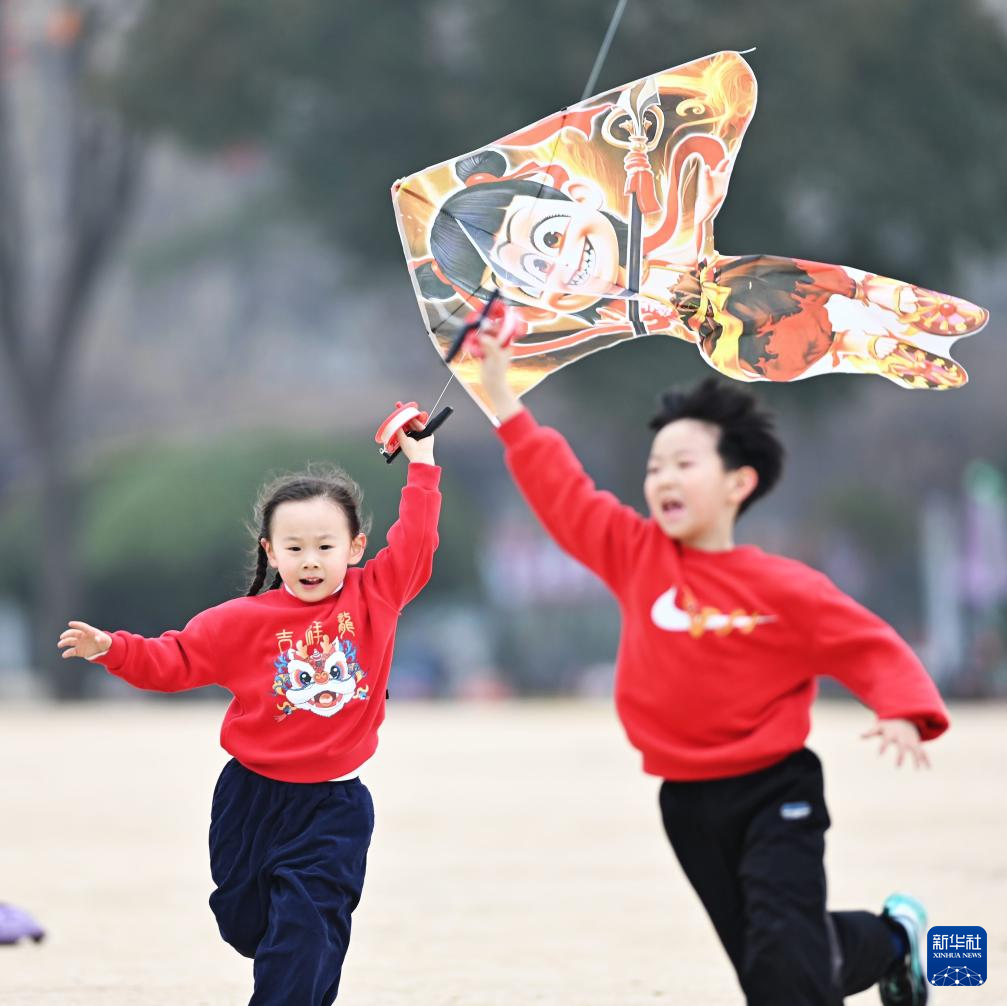 3月1日,小朋友在山东省滕州市一公园放风筝。