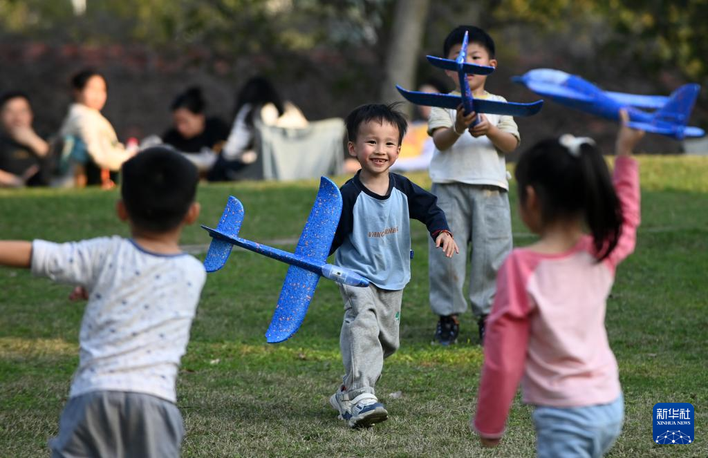 3月2日,小朋友在广西南宁市南湖边玩耍。