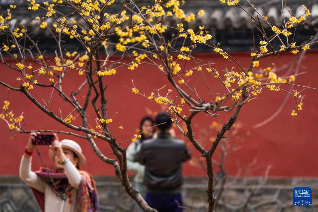 3月1日,游客在北京国家植物园卧佛寺赏花拍照。