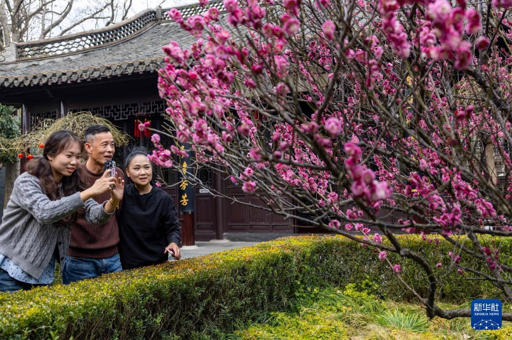 3月2日,游客在江苏泰州海陵区梅兰芳公园赏花拍照。