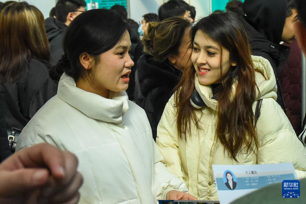 3月2日,在乌鲁木齐市新疆国际会展中心招聘会现场,求职者在分享就业信息。