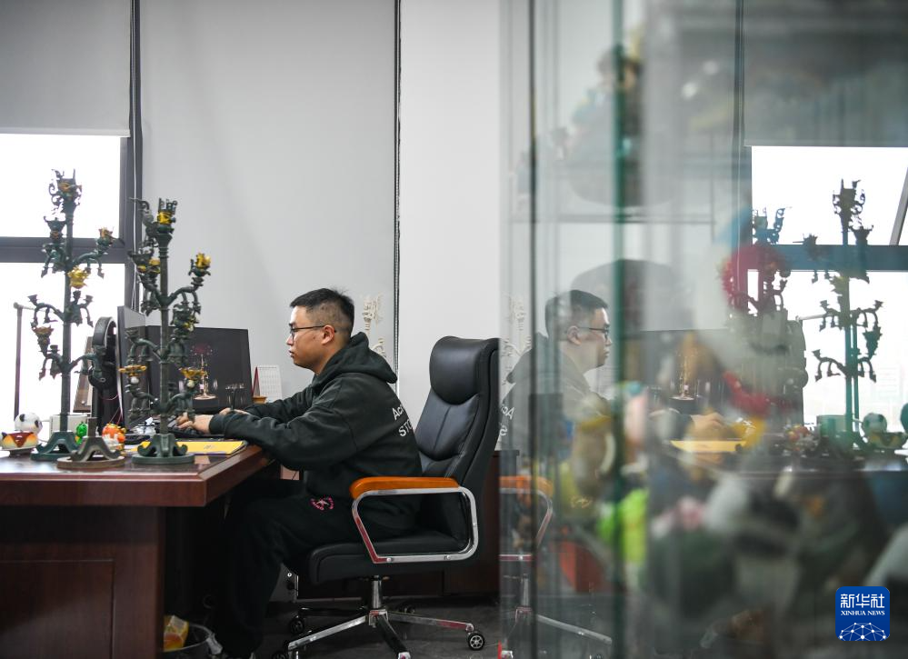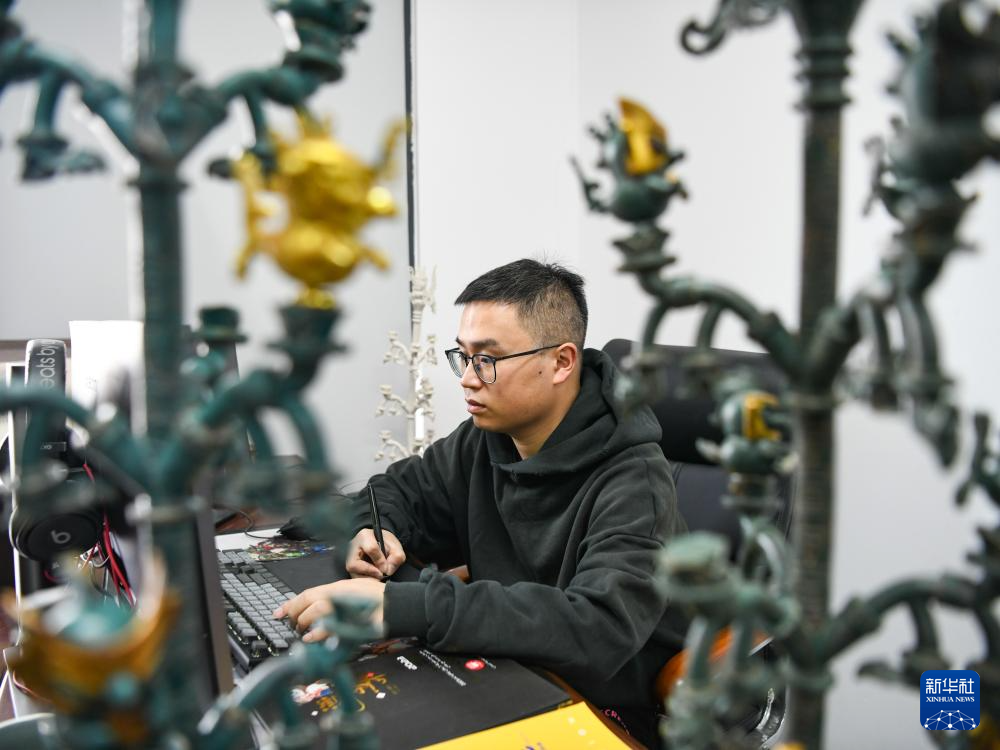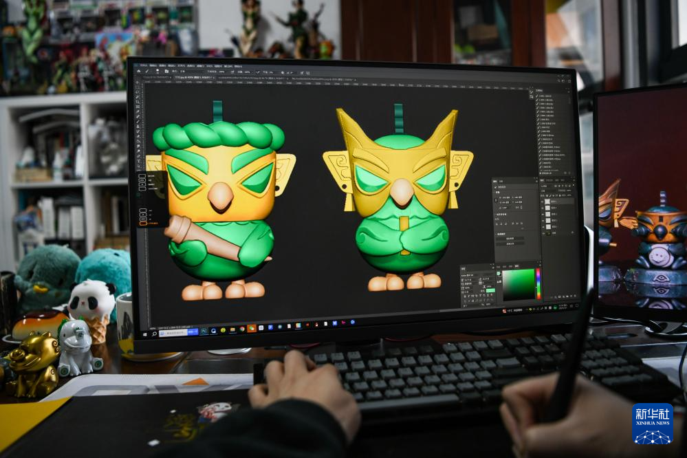 3月1日,曾舟在办公室完善细化三星堆青铜神树文创产品细节。