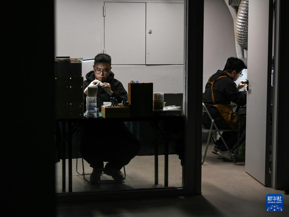 3月1日,曾舟(左)和同事在工作间打磨文创产品模型。
