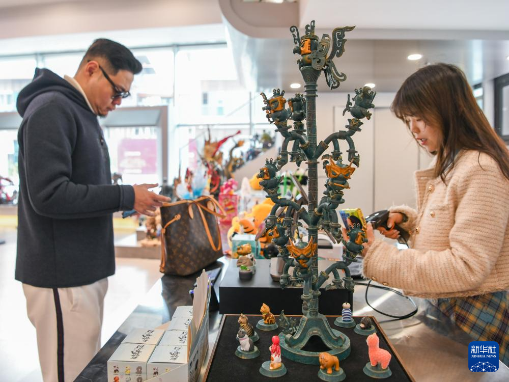 3月1日,在成都天府国际动漫城,顾客在曾舟的店内选购文创产品。