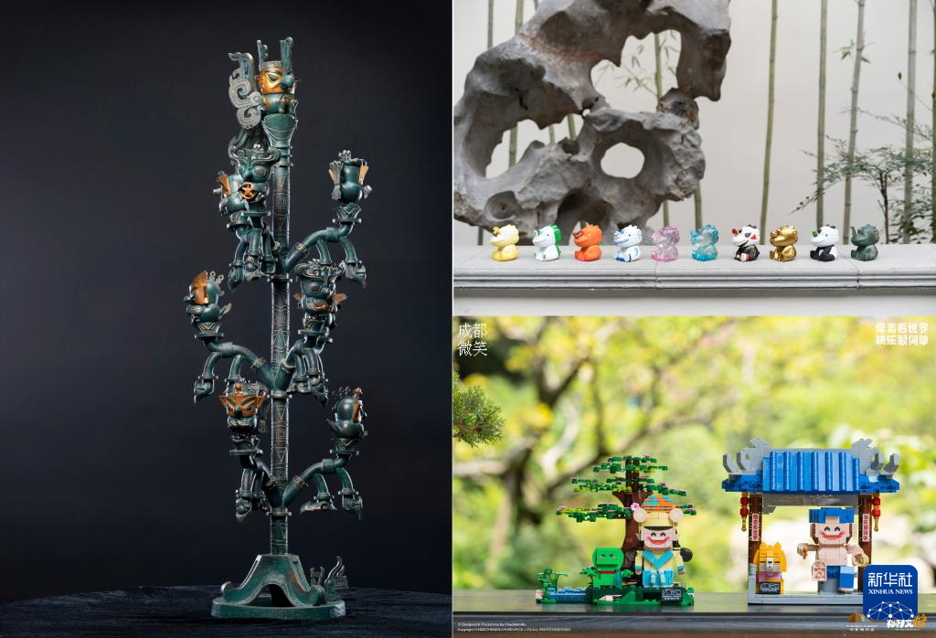 拼版照片:这是曾舟以青铜神树、镇水石犀、说唱俑等为原型设计的部分文创产品。