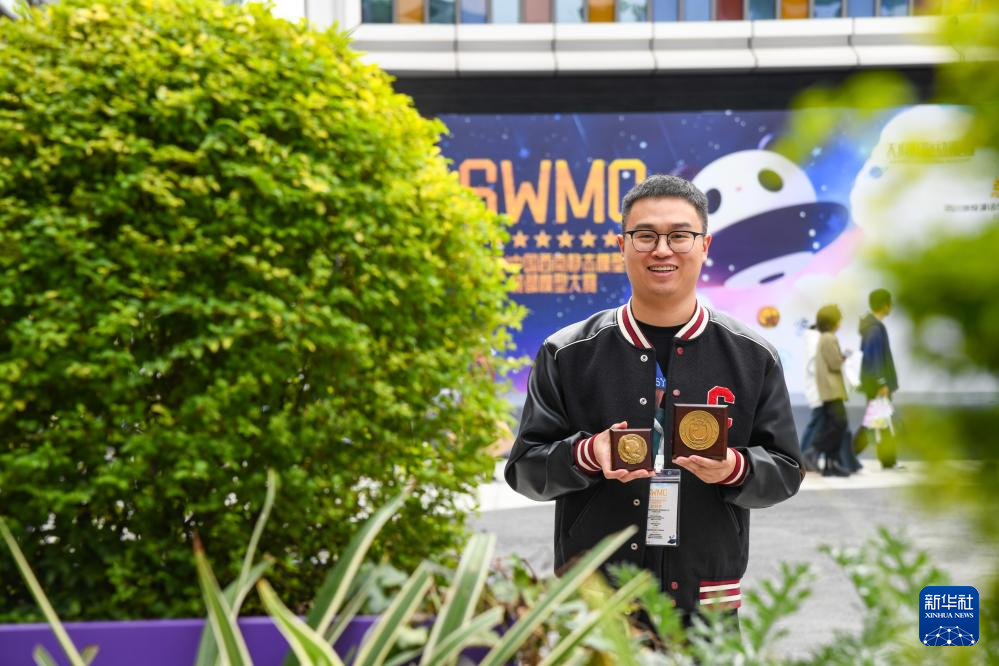 在成都天府国际动漫城,曾舟在展示自己设计的静态模型创意大赛获奖奖牌(2024年10月26日摄)。