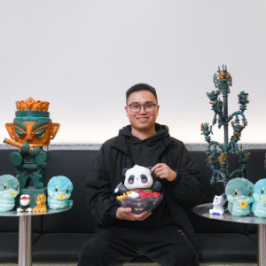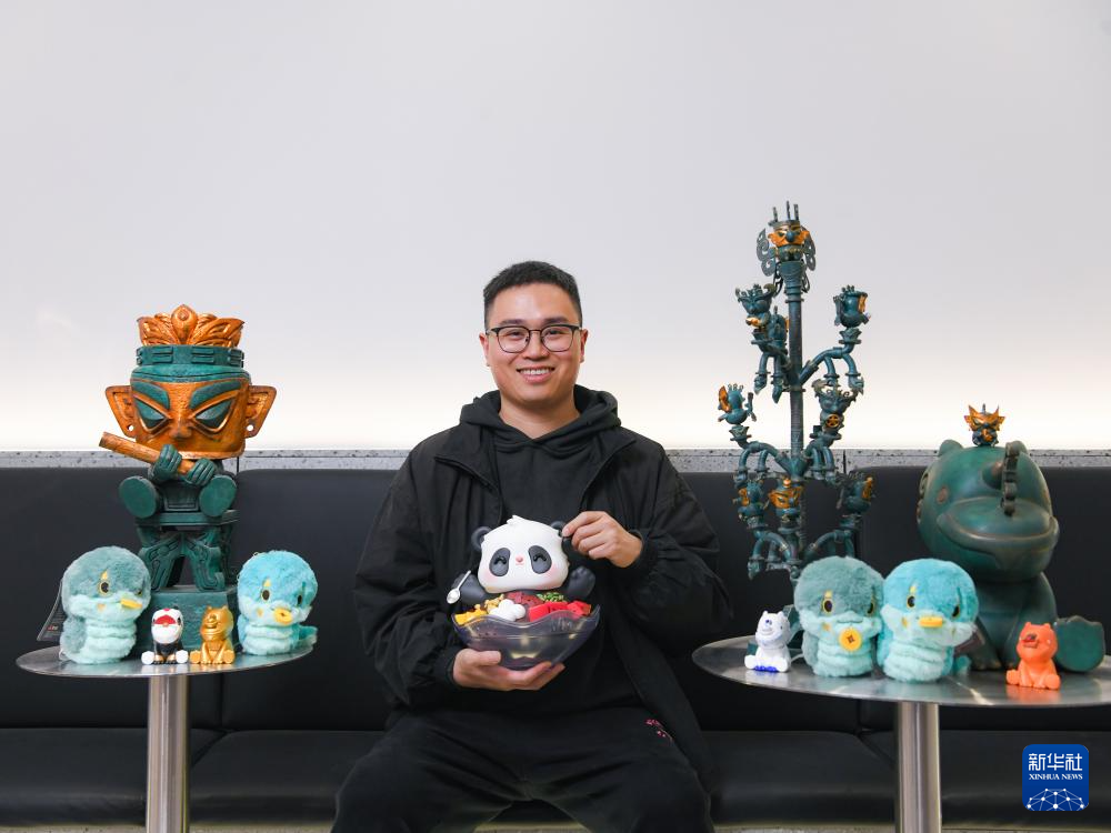 2018年,曾舟辞掉游戏设计的工作,成为独立设计师。一次去三星堆博物馆参观时,馆内的青铜文物造型让曾舟萌生了创作的灵感。他以青铜神树、青铜纵目面具、青铜兽面等文物作为创作蓝本,结合当下的潮玩元素,将模型的身体比例做适当调整,让潮玩作品拥有“千里眼”“顺风耳”和“天然呆”的卡通感,设计的文创作品时尚新潮、俏皮可爱。